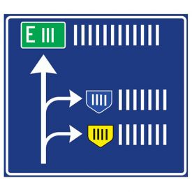 Indicator rutier de orientare F1c Presemnalizarea directiilor la o intersectie de drumuri este instalat la 100-200m de o intersectie de drumuri. Acest indicator presemnalizeaza directiile de urmat pentru locatiile inscrise pe indicator.