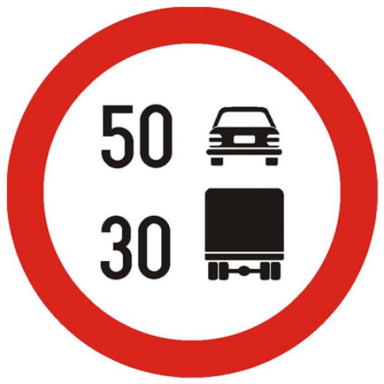 Indicator rutier interzicere sau restrictie C28 Limitare de viteza diferentiata pe categorii de vehicule