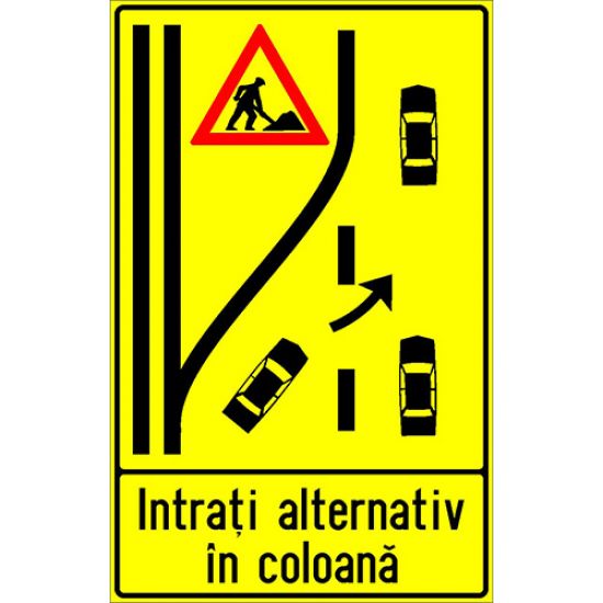 Indicator rutier temporar U37 Intrare alternativa in coloana semnalizeaza soferilor ca, din cauza conditiilor de trafic sau a unor lucrari, trebuie sa permita intrarea alternativa a vehiculelor din benzi diferite, similar principiului fermoarului.