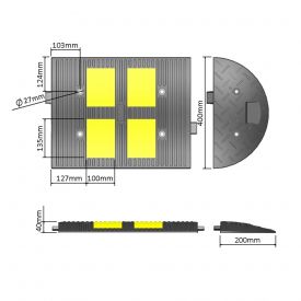 Limitator de viteza 500 x 400 x 40 mm, din cauciuc ce are înălțimea de 40mm și este folosit la încetinirea vitezei de până la 30km/h. Limitator de viteza 500 x 400 x 40 mm, din cauciuc montat cel mai adesea în apropierea grădinițelor, creșelor, școlilor, parcările comerciale, benzinării și în toate zonele în care se dorește limitarea vitezei.