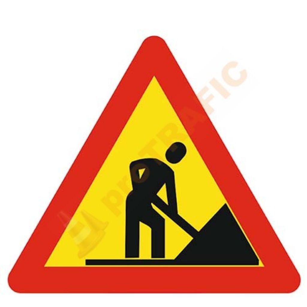 Indicatorul triunghiular din imagine se instalează la 20-200 m de sectorul de drum pe care se execută lucrări. Fondul de culoare galbena semnifică caracterul temporar al lucrării. La întâlnirea acestui indicator, Conducătorul auto este obligat să reducă viteza.