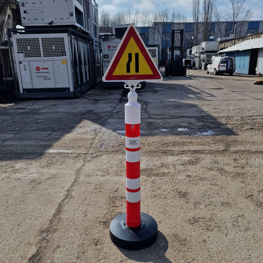 Set stalp dirijare 12kg , indicator Drum ingustat stanga, inaltime 1200mm cu baza de plastic umpluta cu nisip si o greutate de 12 kg, este un dispozitiv mobil si stabil, ideal pentru marcarea diferitelor spatii sau ghidarea traficului in diverse contexte. Acesta este confectionat din plastic durabil, este usor de manevrat si rezistent la conditii atmosferice variate.