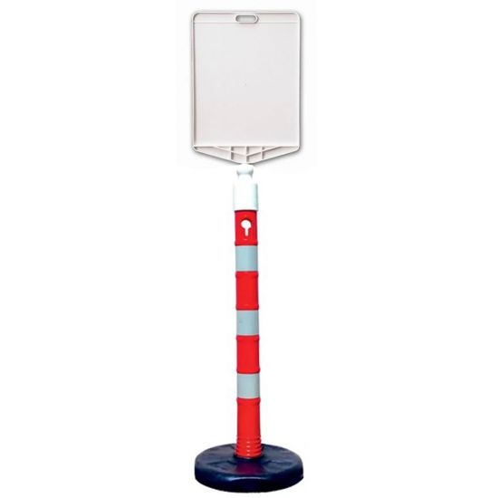 Set stalp mobil cu greutate 6,5kg cu indicator plastic neinscriptionat este un echipament de dirijare si semnalizare fabricat dintr-un plastic rezistent conceput pentru a rezista la uzura si conditiile atmosferice variate. Baza de cauciuc adauga greutatea necesara pentru a mentine stalpul in pozitie veritcala si pentru a impiedica rasturnarea acestuia in conditii de vant sau impact. Este utilizat la marcarea diferitelor spatii, ghidarea traficului sau pentru alte scopuri practice la interior sau exterior.